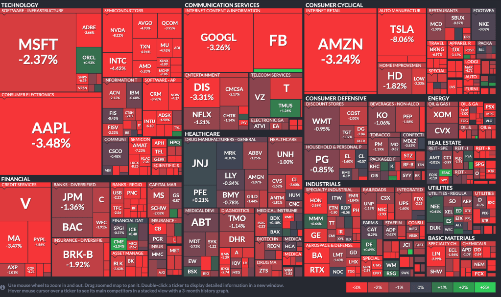 今日の写真は、昨日(2021年2月25日)の米国株式市場のヒートマップのスクショです。赤が下落、緑が上昇をした銘柄を表しているのですが・・・まあー、見事に真っ赤っ赤ですねー・・・( ;∀;)。これは一応セクター別に配列されていて、ハイテク株、金融株、食品、衣料品、などのセクションに分かれているのですが、ほんの一握りの銘柄を除いて、どこのセクターもほぼ一緒に下落しているのが見えるかと思います。まあ、こうなってくると、いくらセクター別に分散投資していても救いはありません。全員討死になのです・・・・( ̄▽ ̄;)。
