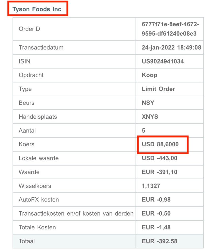 1月24日に、Tyson Foodsの株をUSD88.60で5株買いました。