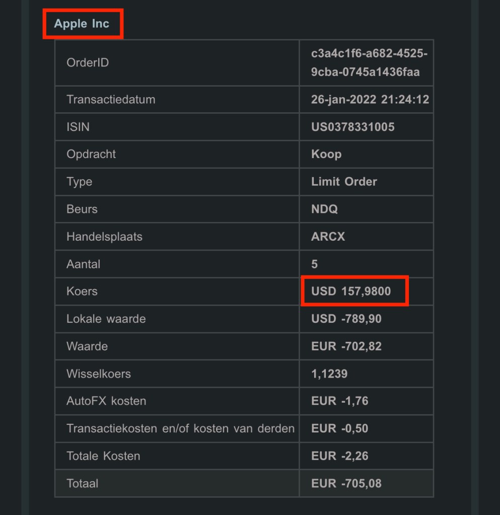 1月26日に、Appleの株をUSD157.98で5株買いました。
