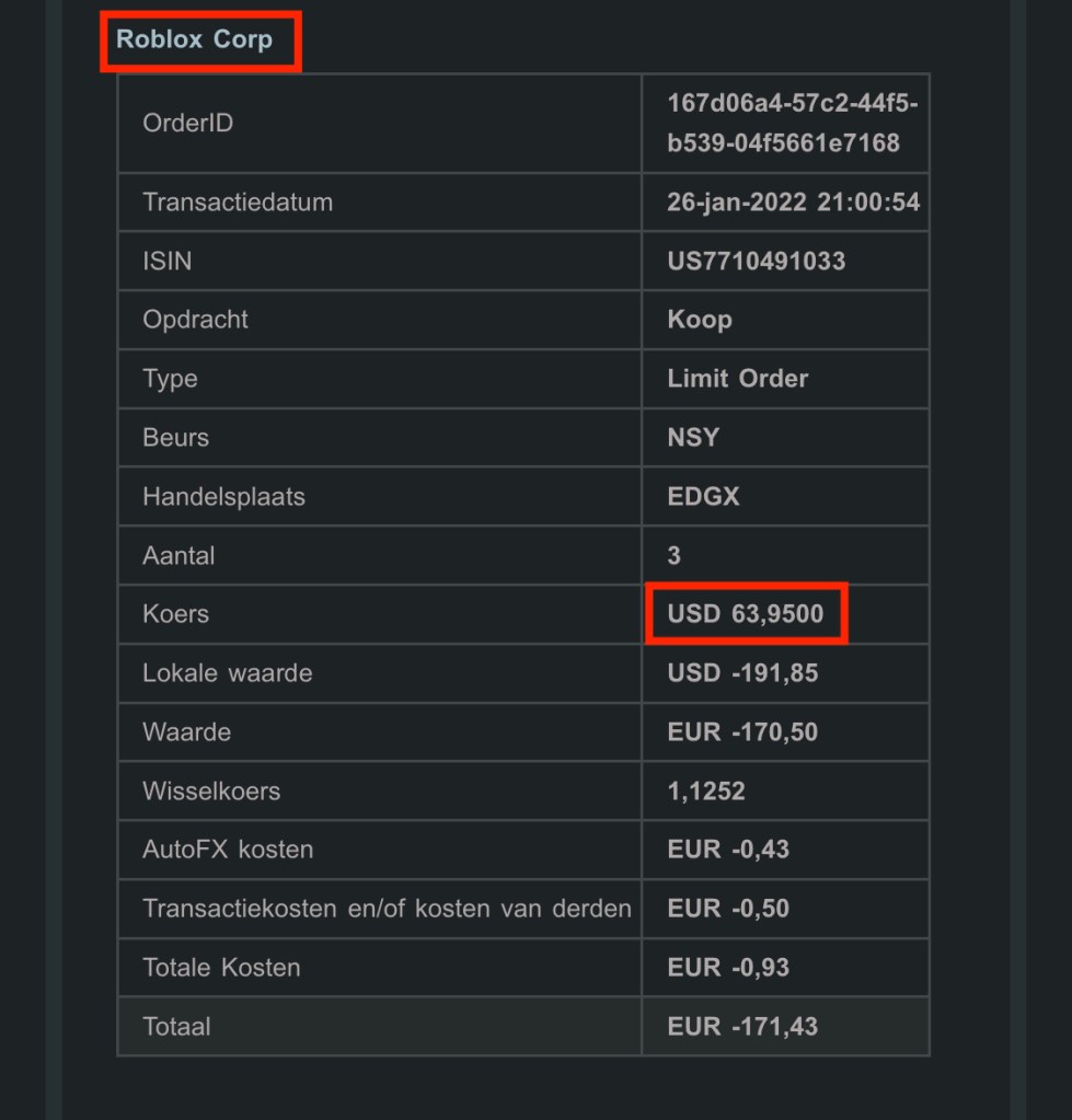 1月26日に、Robloxの株をUSD63.95で3株買いました。